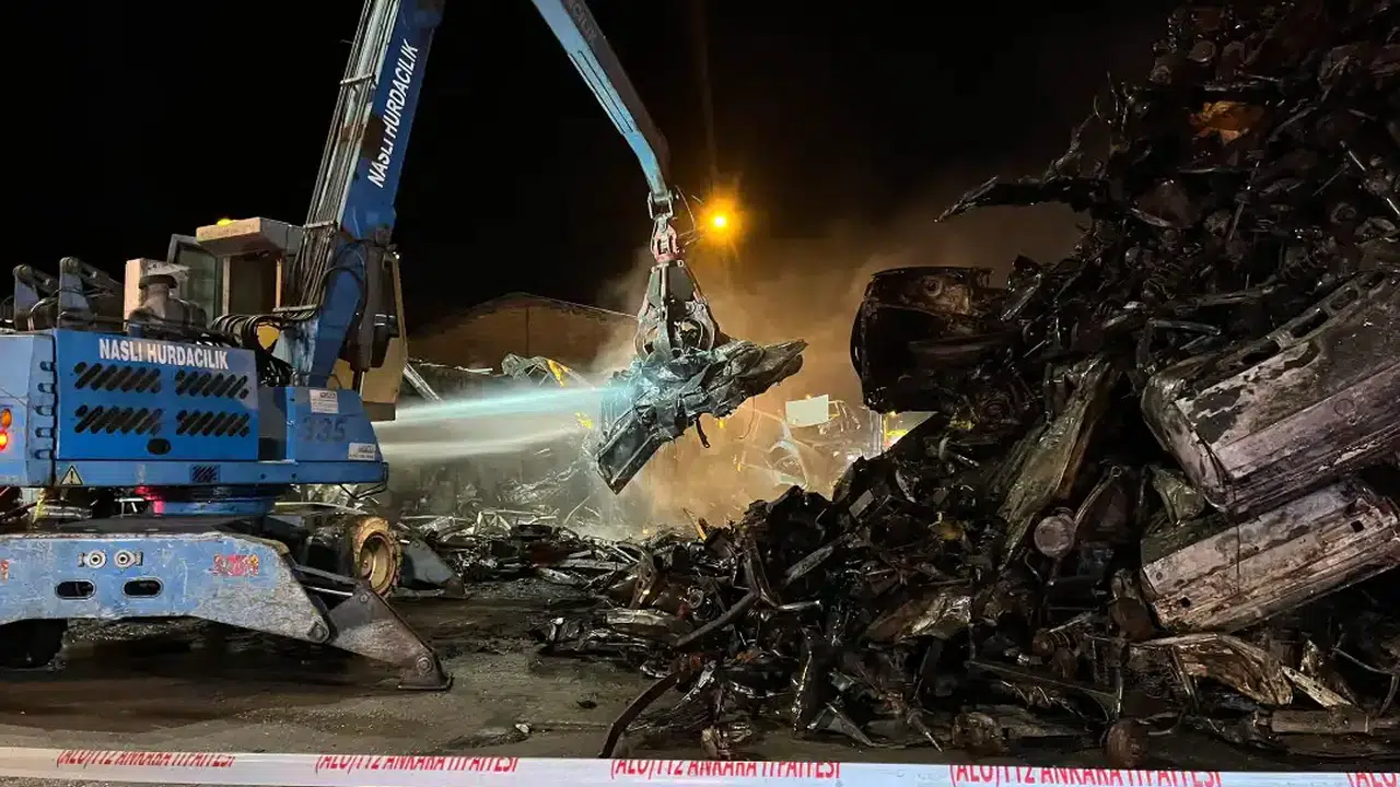 Yangının yeniden büyümesini önlemek için ekipler vinç yardımıyla hurda araçları tek tek kaldırarak bölgede soğutma çalışması gerçekleştirdi.