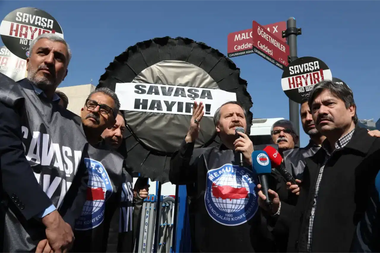 Açıklamanın ardından Memur-Sen üyeleri, üzerinde “Savaşa hayır” yazılı siyah çelengi ABD Büyükelçiliği önüne bıraktı.
